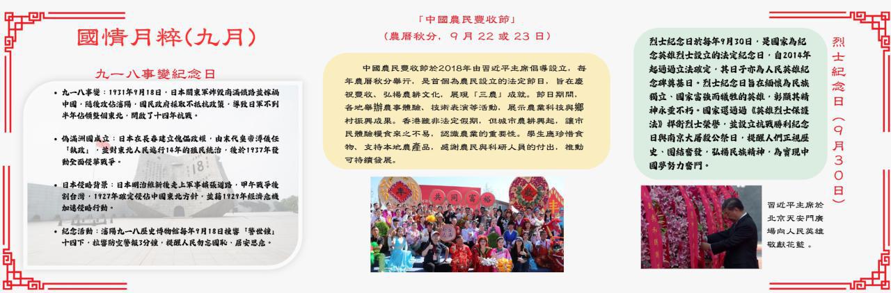 本校於「九‧一八」事變紀念日舉辦國旗下講話、師生分享、國情月粹展板及於課堂討論「九‧一八」事變等活動,鼓勵師生共同銘記歷史,緬懷先烈,珍愛和平,開創未來。