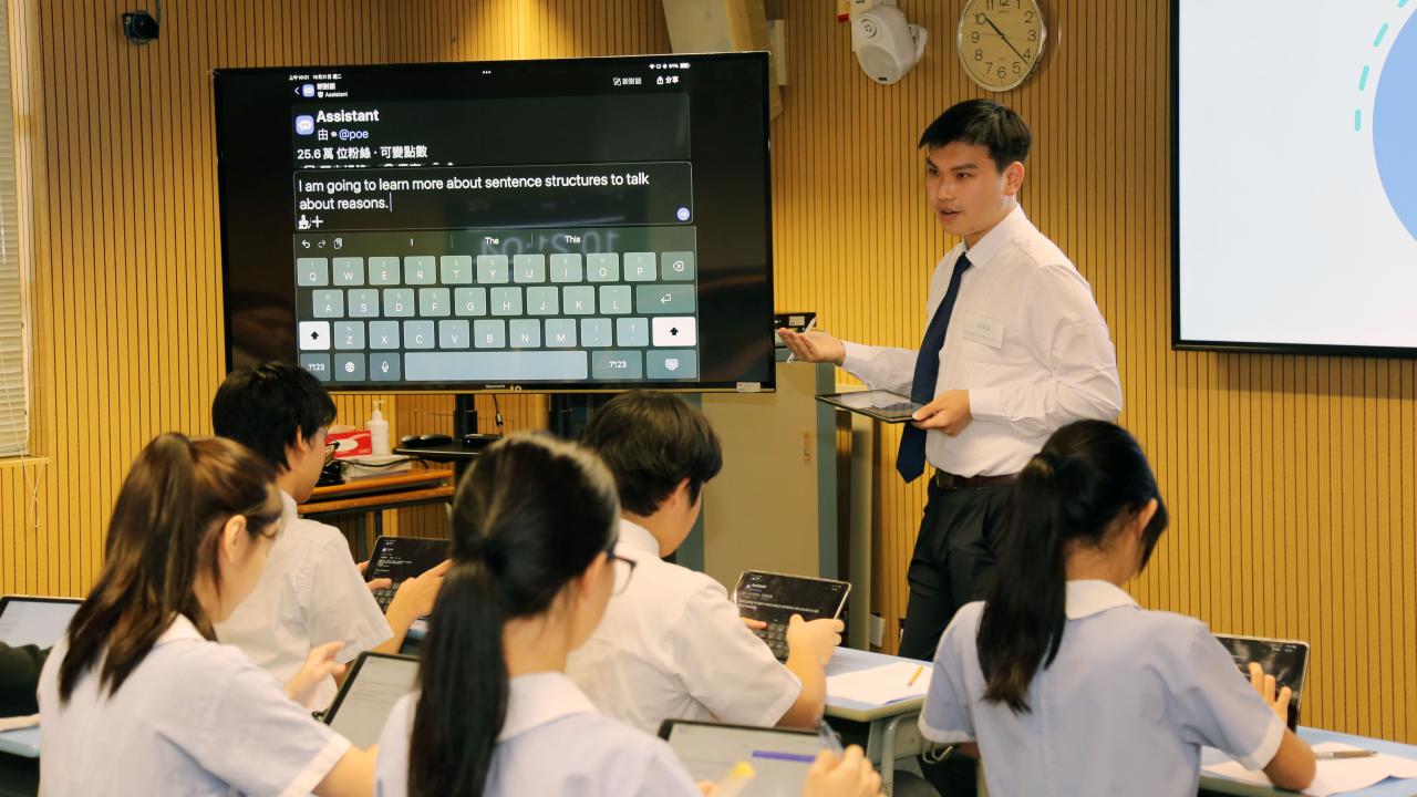 在英文科的展示課堂中,學生運用人工智慧工具探索多樣的句型結構,以探討香港社會中愈來愈多人採用無現金支付方式的原因,並將所學句型運用於寫作任務之中。與此同時,學生輸入提示(prompt)的過程被展示出來,藉以呈現其思考與表達的歷程。此環節進而引導至同儕評估活動,讓學生能夠辨識同儕作品中的優勢與待改進之處,從而促進學習成效的提升。