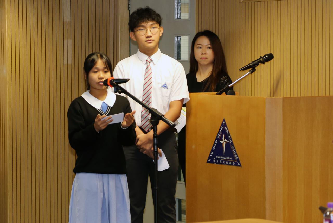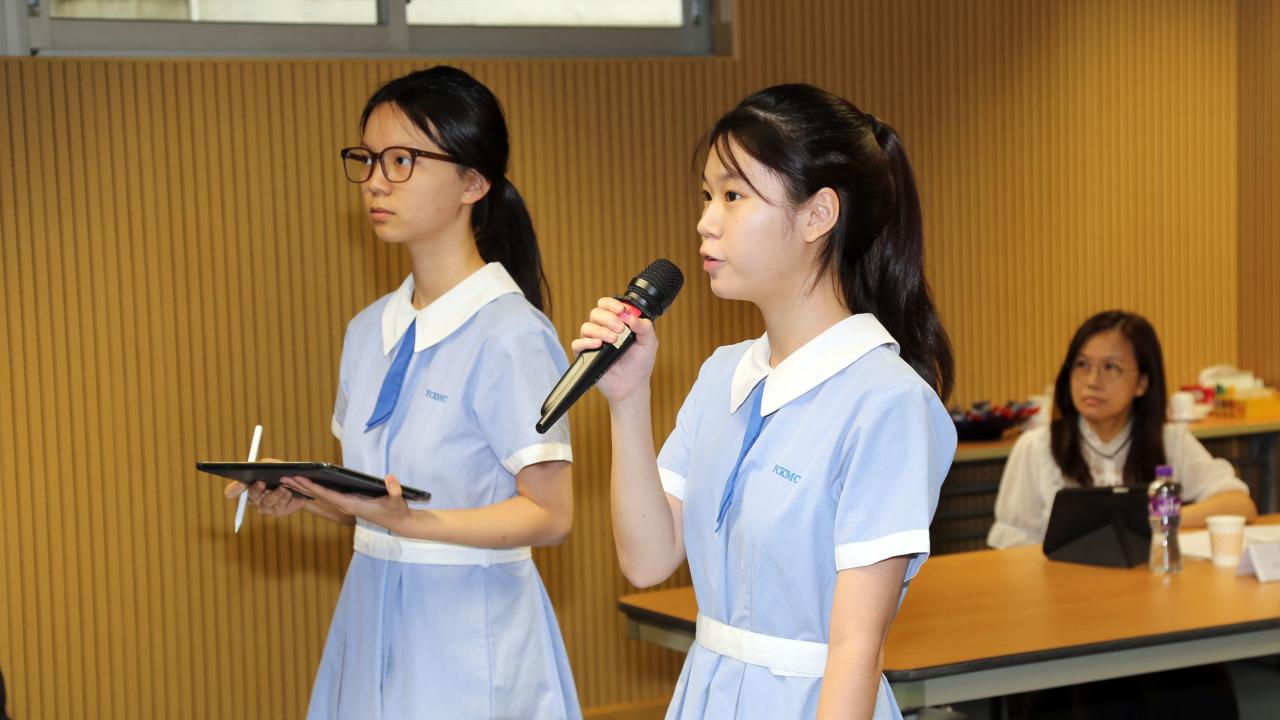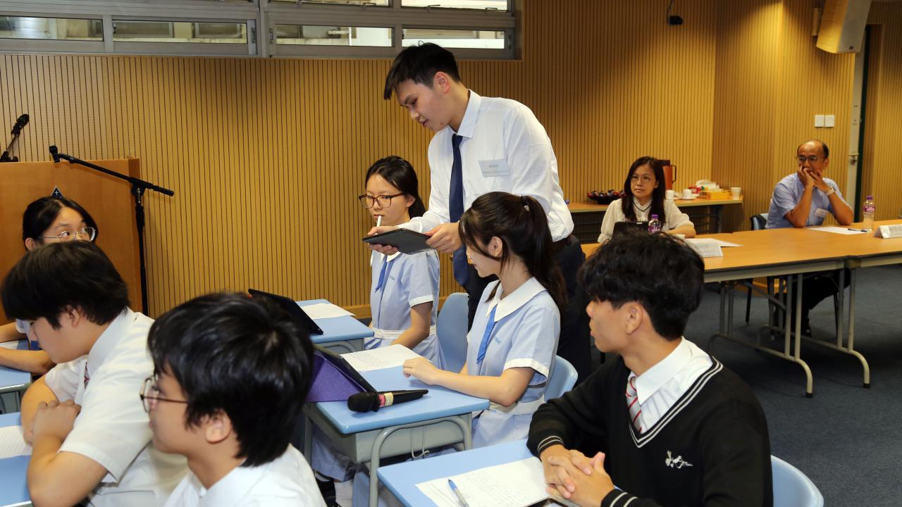 兩位中三級同學向施副局長匯報中國語文科如何運用人工智能提升學生的學習動機和寫作技巧。教師設計預習工作紙,讓學生運用人工智能工具進行寫作前的預習,這不單能延展「學時」,亦能提升學生的自學能力。就如中二級寫作描寫文<街市所見所聞>,學生運用不同人工智能工具生成「聽覺描寫」,老師在課上會展示同學的預習成果,讓同學就生成的「聽覺描寫」作比較和評價。同時,每個中二級學生都備有一本「人工智能使用字典」,當學生寫作任何景物描寫文時,可以依自己的需要輸入指令,並學懂追問,去豐富文章的內容和修辭技巧,做到自主學習。在最後的環節,同學更展示人工智能生成資料的不足之處,學生通過詢問另一人工智能工具、老師意見以及同學討論,去查證資料是否正確,這教導學生運用人工智能的同時,也要抱著「求真求證」的精神。