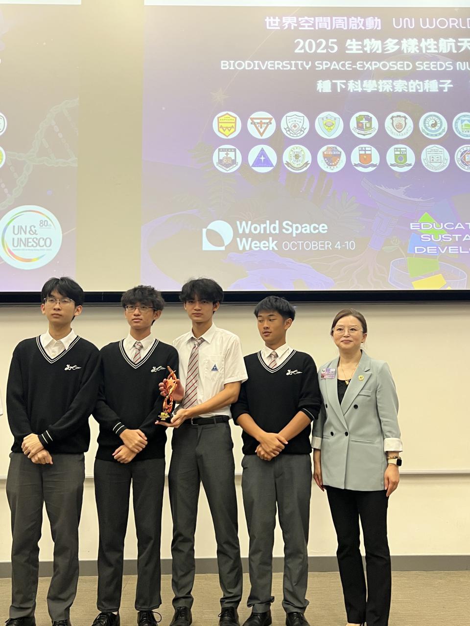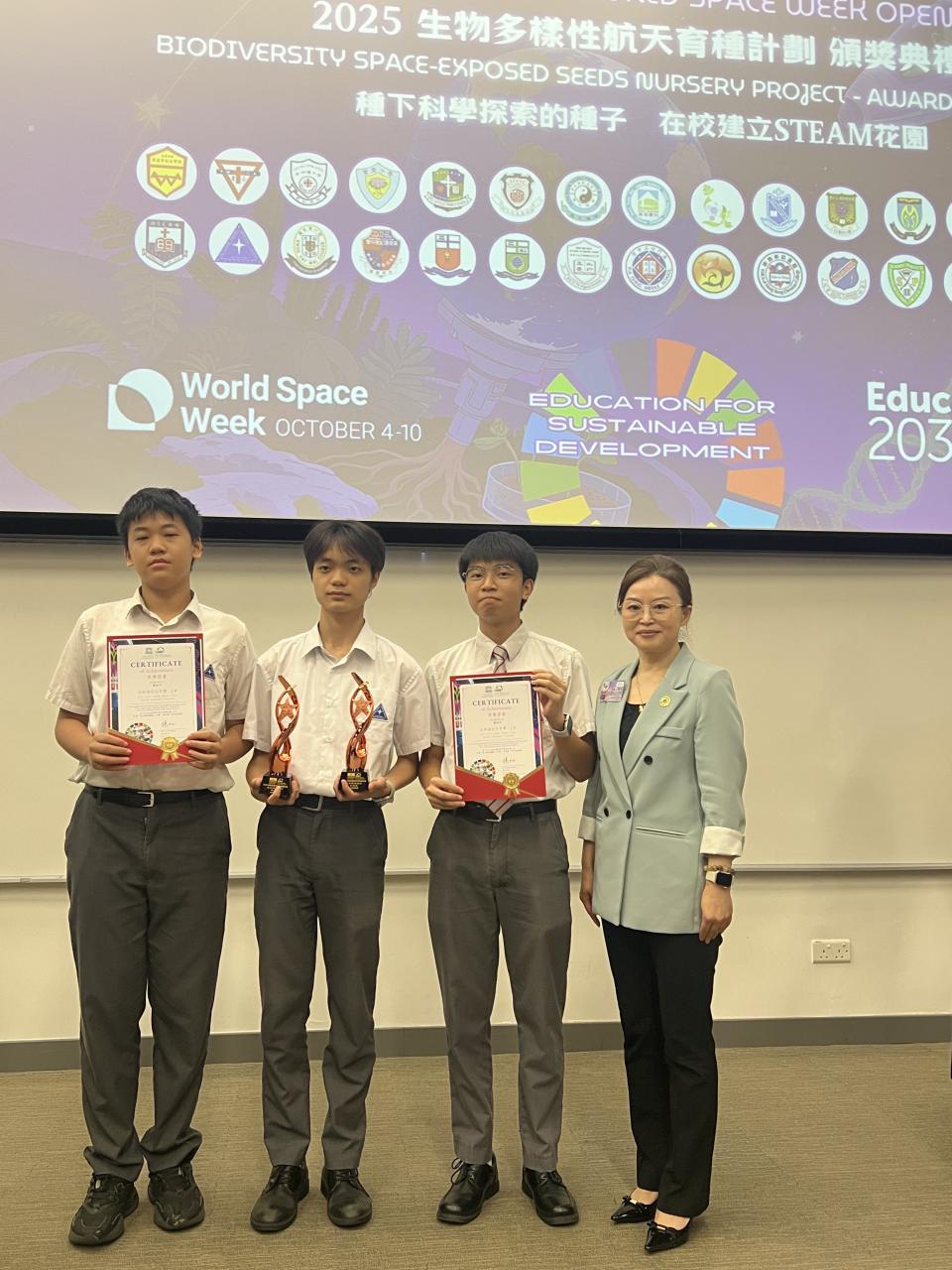 本校12位同學在由香港可持續發展教育學院主辦的「2025生物多樣性航天育種計劃」中表現卓越,榮獲多個獎項。上星期六(10月4日),老師帶領同學出席於香港中文大學康本國際學術園舉行的頒獎典禮。本校其中一隊由5D邵穎怡、5D葉子忱、5D羅卓琳及5B江文錚組成的隊伍,在現場匯報及答辯環節中表現優異,成功擊敗其他學校,榮獲本屆比賽最高榮譽——「航天種植體驗綜合卓越獎」高中組 (金獎)。