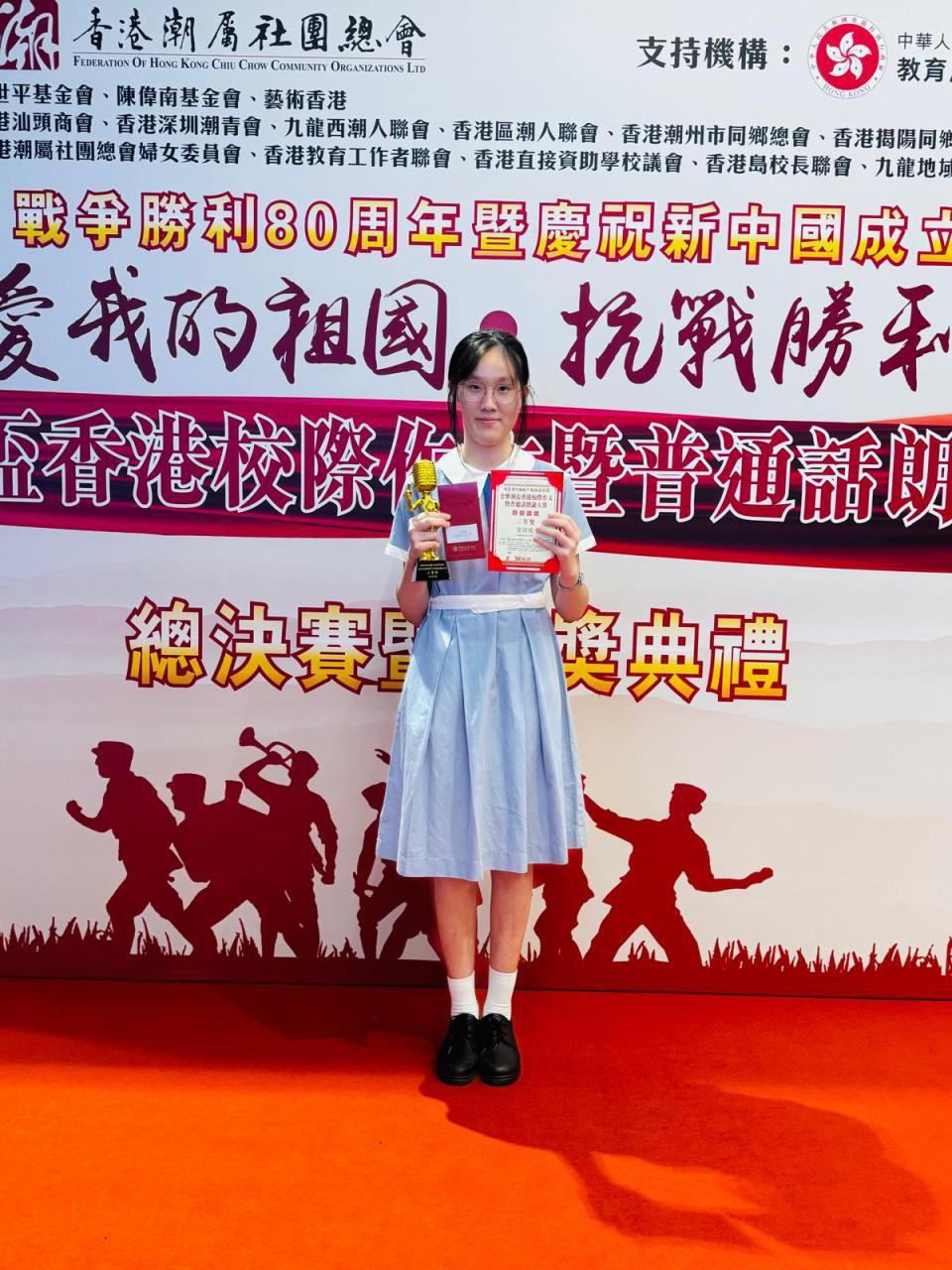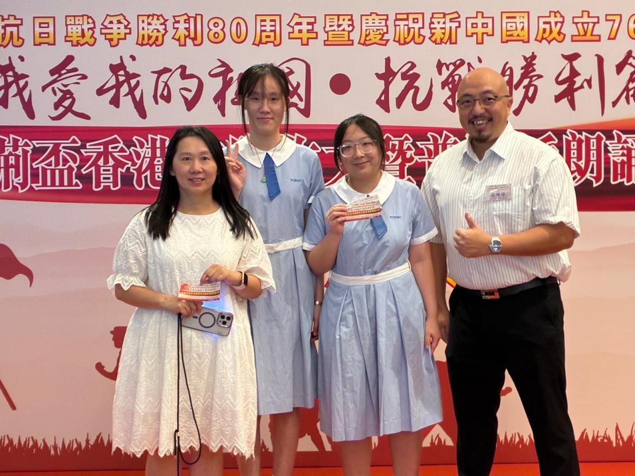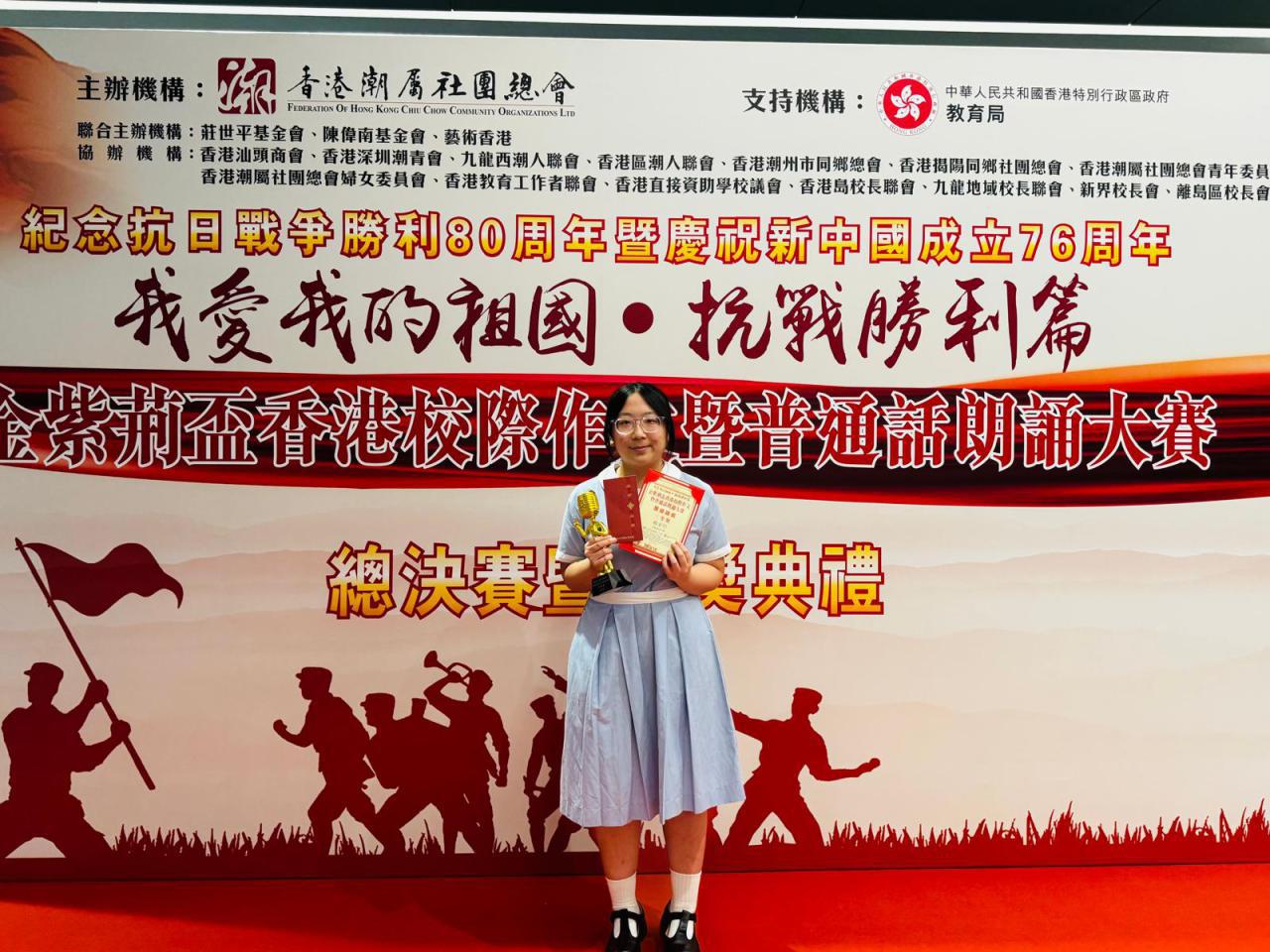 6D蘇家玲、6D葉韻儀在「紫荊盃2025-我愛我的祖國:抗戰勝利篇」香港校際作文及普通話朗誦大賽(中學組)獲得「三等獎」「金紫荊盃2025」作文及普通話朗誦大賽(中學組),每所學校提名兩位同學參賽,經過「初賽」和「複賽」,兩位女生能在激烈的競爭中獲得「三等獎」,實屬不易,值得鼓勵。得獎學生獲頒獎狀和獎金,學校獲頒獎盃一座。